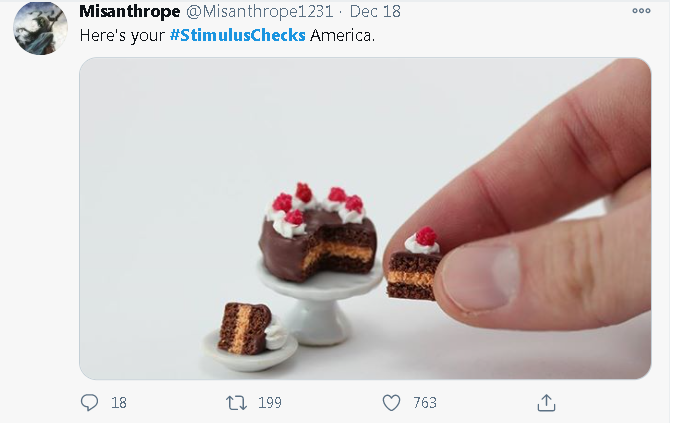 △有美国网民发文称,“这就是你的刺激支票”,配图是一块比指尖还小的蛋糕