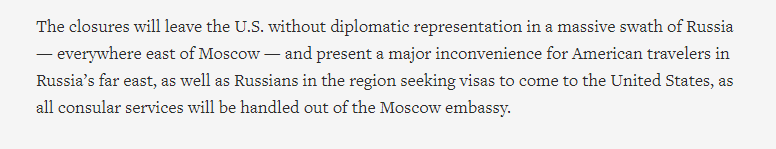 而据美国有线电视新闻网(CNN)报道,美国国务院之前将闭馆计划通知国会时称,该计划是为了应对2017年后俄对美外交人员设限,以及因双方外交签证问题陷入僵局所导致人员不足的挑战。