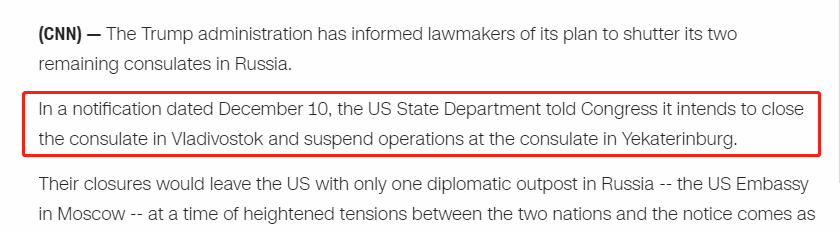 目前具体关闭时间尚未确定,不过可以确定的是,两处总领事馆关闭后,美国在俄罗斯的外交设施将仅剩位于莫斯科的驻俄大使馆。