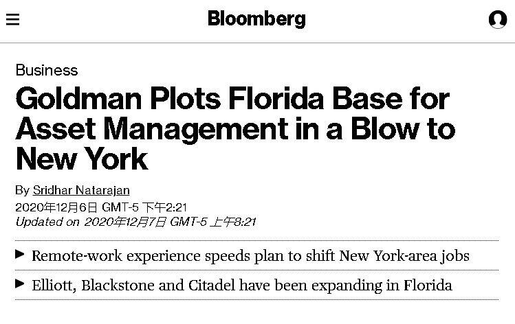 据彭博社报道,高盛集团正考虑在佛罗里达州设立新总部,以容纳其资产管理部门。高盛新改组的资产管理部门每年产生约80亿美元收入,是集团商业模式多元化的重要支柱。不少市场人士认为,如果高盛迁出这项业务,可能引发其他金融机构仿效,从而影响纽约作为美国金融中心的地位。