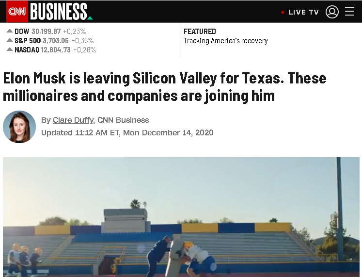今年年底,硅谷流传最广的一条消息是,特斯拉公司首席执行官埃隆·马斯克在一次采访中表示,他已经从加利福尼亚州搬到了得克萨斯州。他表示,特斯拉在得州的新工厂正处于建设阶段,同时哀叹加州已经变得过于“自满”。马斯克也因此成为新冠疫情期间搬离硅谷的最知名企业家之一。
