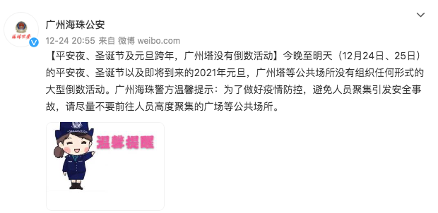 @广州海珠公安 近日发布提醒称,2021年元旦,广州塔等公共场所将不举办任何形式的大型倒数活动。
