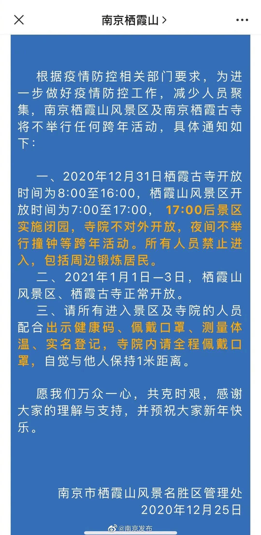 南京灵谷寺近日发布消息称,将取消元旦、除夕撞钟祈福活动,由寺院常住法师为大家诵经祈福;2020年12月31日晚元旦跨年撞钟取消;2021年1月20日腊八施粥取消;2021年2月11日除夕跨年撞钟取消。