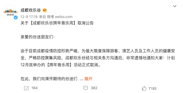 @成都欢乐谷 近日发布公告称,计划12月底举办的跨年音乐周活动正式取消。