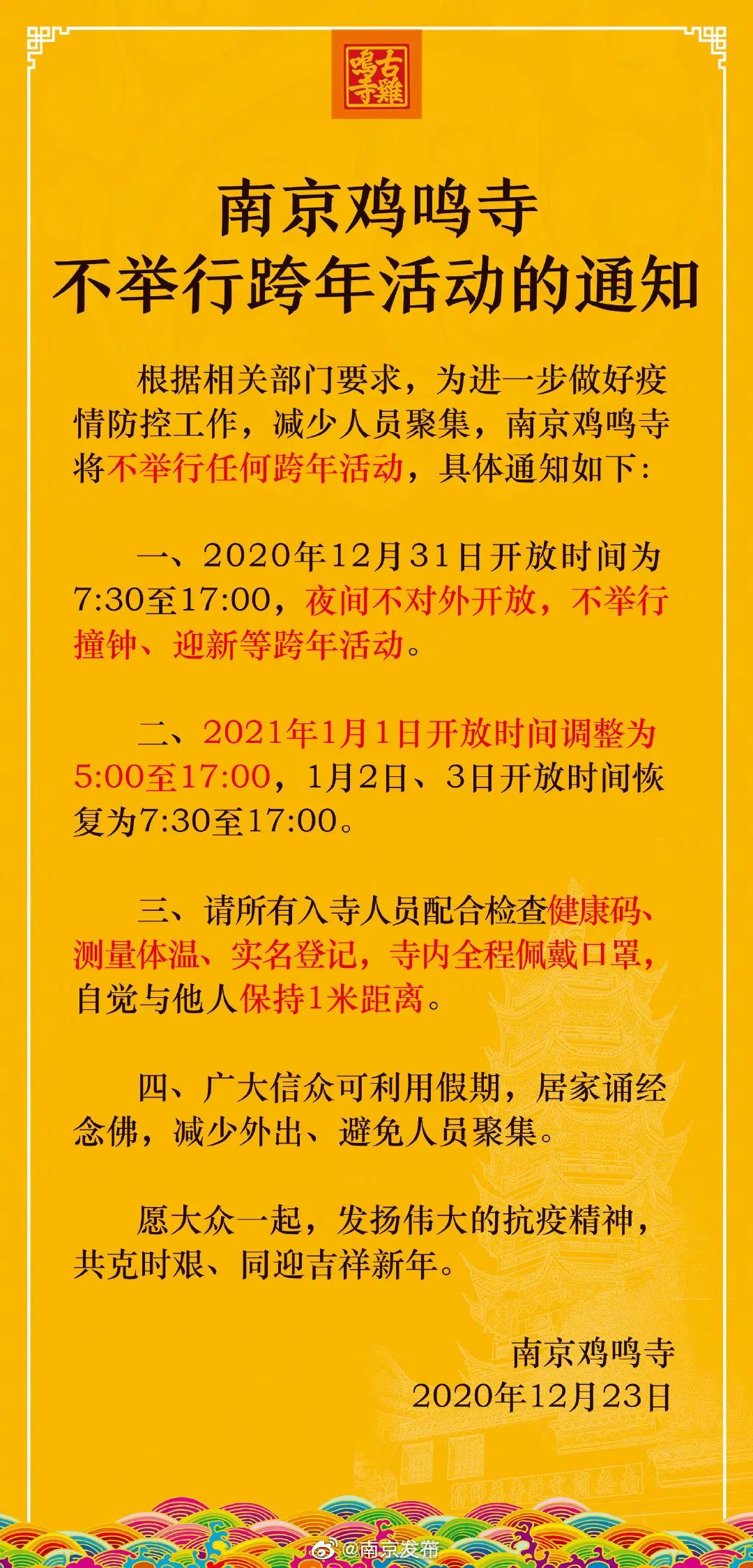 南京鸡鸣寺也在其相关通知中指出,南京鸡鸣寺在12月31日开放时间改为7时30分至17时,夜间不对外开放,不举行撞钟、迎新等跨年活动。