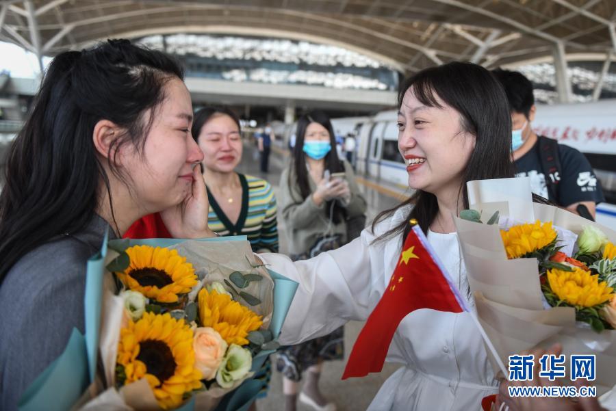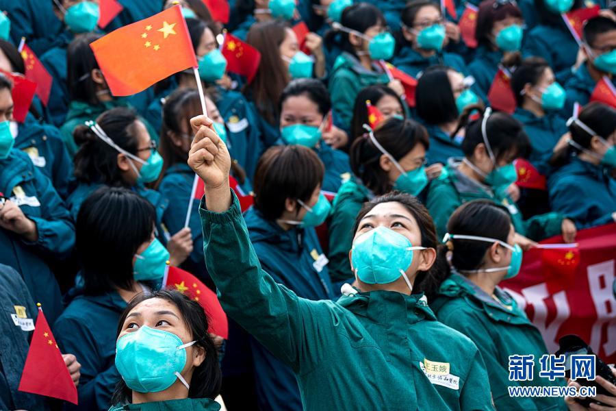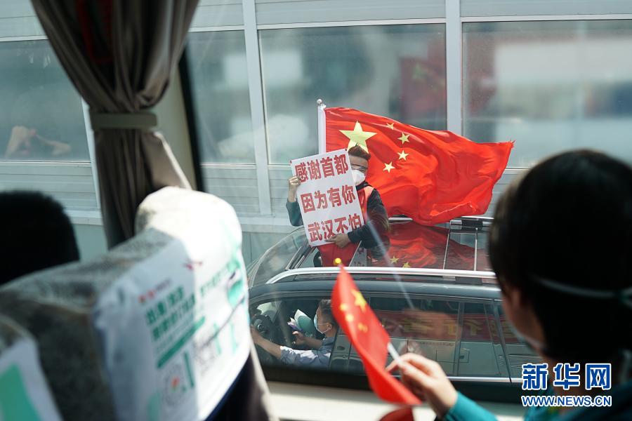 4月15日,武汉市民挥舞国旗,送别北京协和医院国家援鄂抗疫医疗队。新华社记者 熊琦 摄