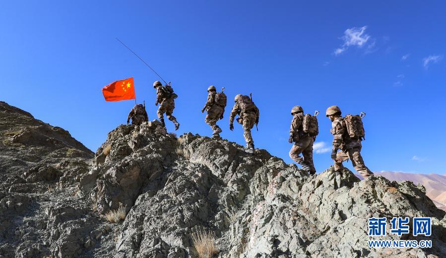 10月1日,西藏阿里军分区某边防团巡逻分队官兵沿山脊向点位行进。新华社发(刘晓东 摄)