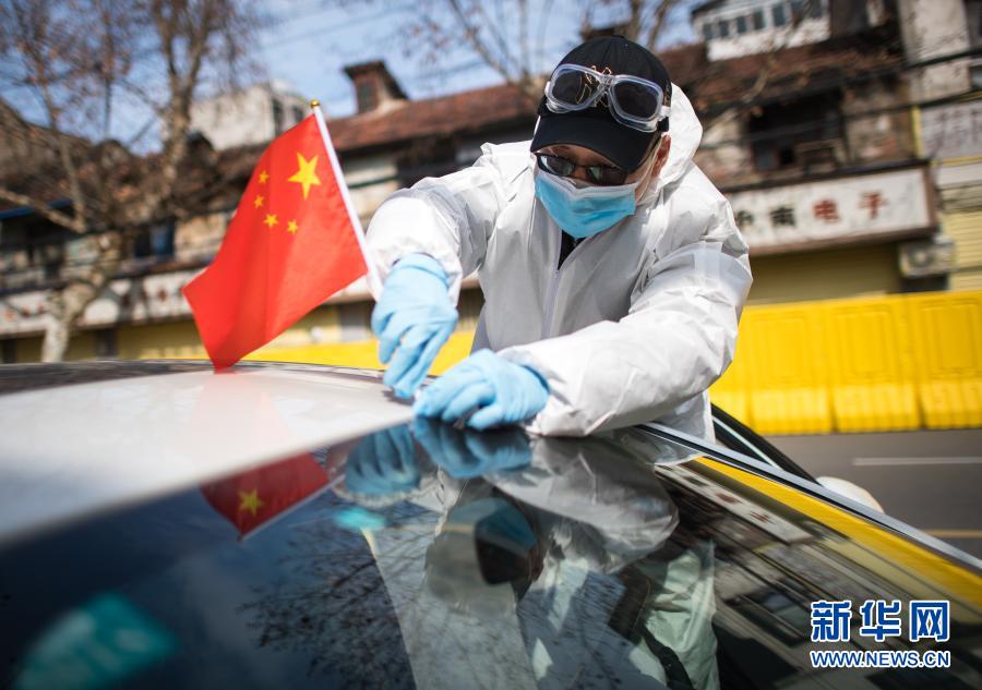 2月29日,“W大武汉紧急救援队”队员朱伟将国旗插在车上。疫情期间,由志愿者组成的“W大武汉紧急救援队”接送缺乏交通工具去医院的待产孕妇,成为即将出生的新生命的“摆渡人”。新华社记者 肖艺九 摄