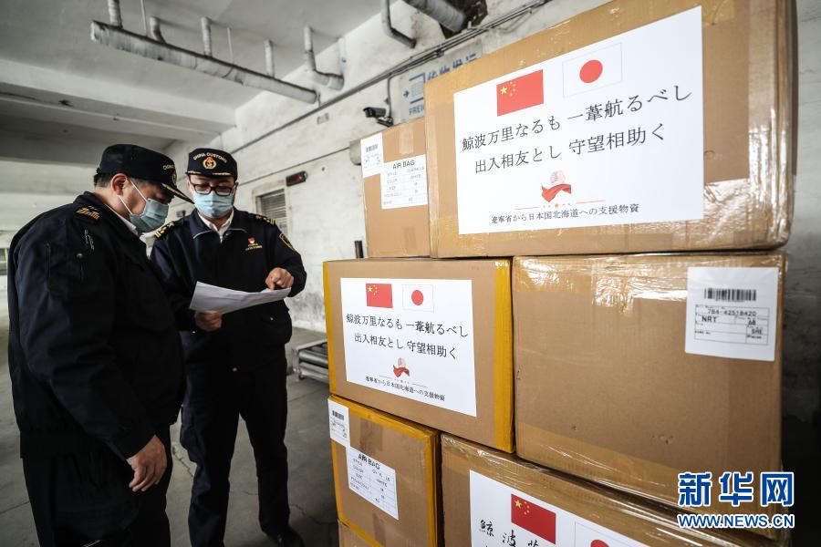 3月15日,沈阳海关工作人员检查捐赠给日本的防疫物资。 当日,捐赠日本的防疫物资从沈阳发往日本,助力日本抗击疫情。新华社记者 潘昱龙 摄