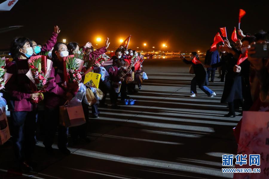 4月7日,国家援鄂医疗队队员抵达北京首都国际机场,与到场迎接的亲友相见,期待着14天隔离后的团聚。新华社记者 张玉薇 摄