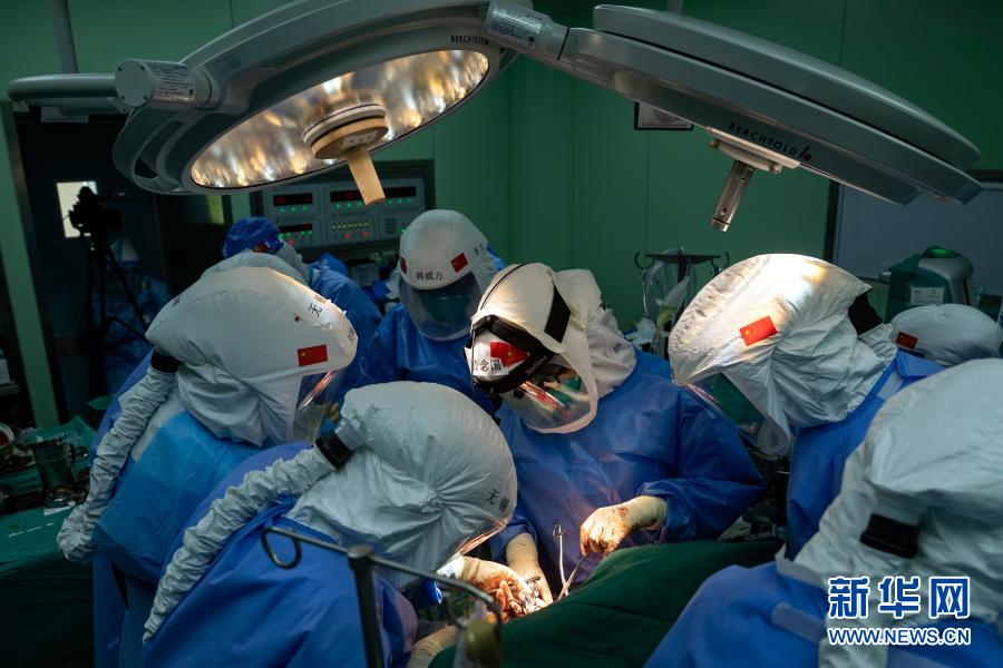 4月24日,武汉协和医院器官移植中心主任董念国(中)为新冠肺炎患者实施肺移植手术。新华社记者 沈伯韩 摄