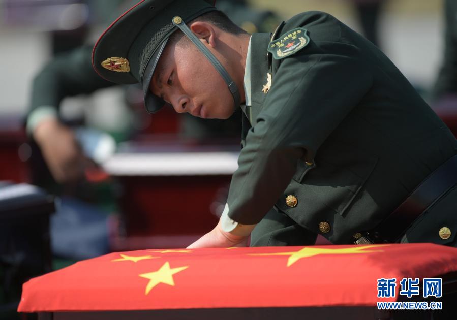 9月27日,在沈阳桃仙国际机场,礼兵在殓放志愿军烈士遗骸的棺椁上盖上国旗。当日,第七批在韩中国人民志愿军烈士遗骸由中国空军专机护送从韩国接回辽宁沈阳。新华社记者 杨青 摄
