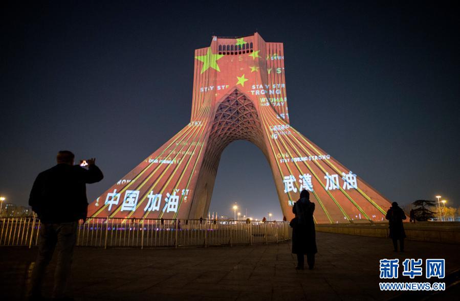 2月18日,伊朗首都德黑兰地标建筑自由塔上演灯光秀,为中国抗击疫情加油。新华社发(艾哈迈德·哈拉比萨斯摄)