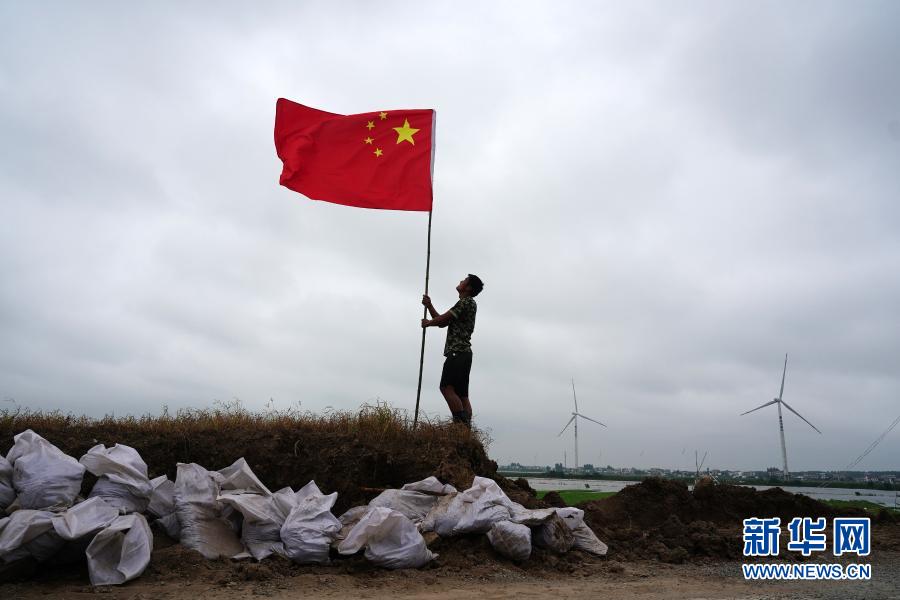 7月16日,在江西省九江市,退役军人张恒扶正防洪哨所门前的国旗。洪水来袭,曾服役于天安门国旗护卫队的张恒同父亲一起投身防汛抗洪战斗。他说,过去我护卫的是国家的荣誉和尊严,现在我守卫的是父母和家乡。新华社记者 周密 摄
