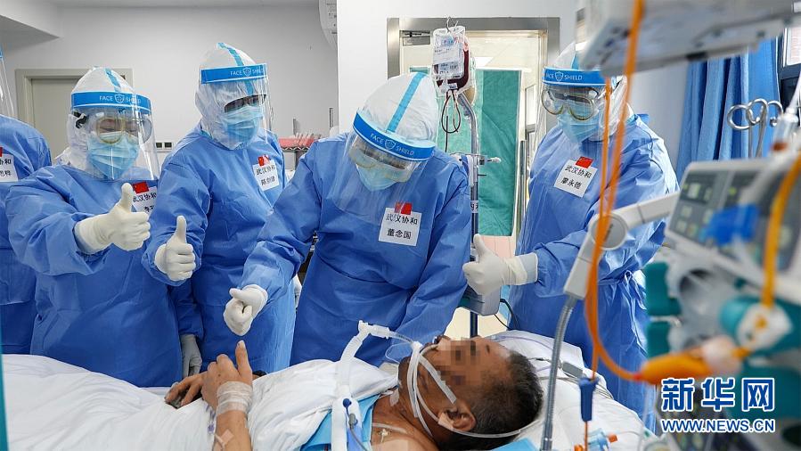 5月8日,武汉协和医院医务人员向新冠肺炎患者成功撤除ECMO表示祝贺。新华社发