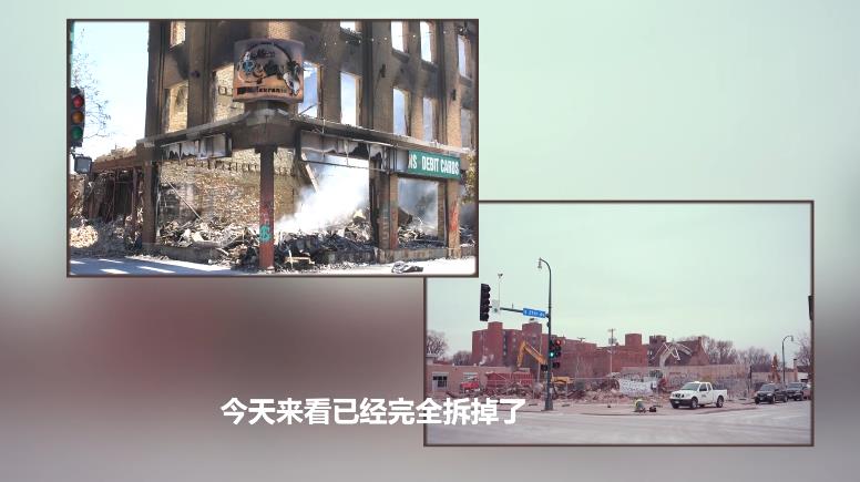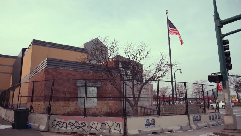 这里就是弗洛伊德被白人警察用膝盖锁喉的地方,你看,墙上还有弗洛伊德的涂鸦,夏天的时候,民众像是潮水一样来这里献花,在这里控诉美国警察的暴力执法。现在到了冬天,明尼阿波利斯的气温降到了零下十几摄氏度,街上的人也消失了。