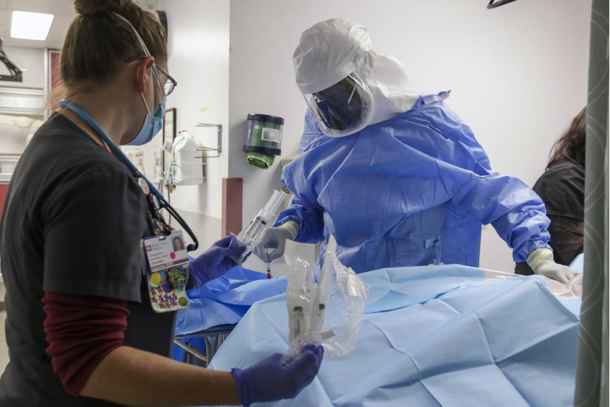 △医护人员对新冠肺炎患者进行治疗 图片来源:《洛杉矶时报》