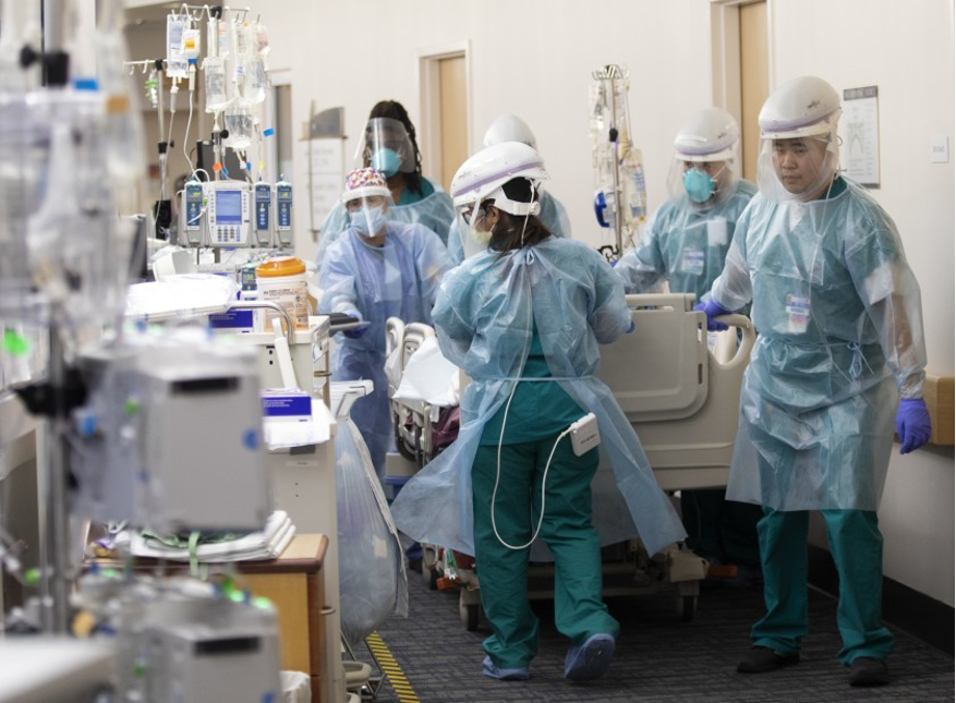 △加利福尼亚州一间医院里的医护人员将新冠肺炎患者推入病房。图片来源:《洛杉矶时报》