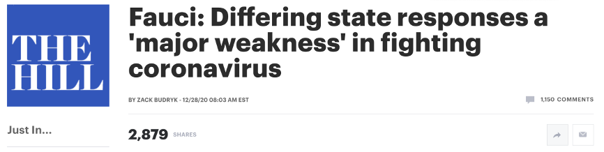 福奇说,“一些简单的防护措施,比如戴口罩已经变成一种政治表态;避免聚集、远离聚集人群,也变成了政治表态。这给眼下无法预测的疫情防控制造了巨大的麻烦。”