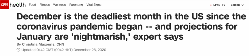 CNN在报道中指出,12月早些时候,美国批准了两款新冠疫苗,给民众带来了一丝希望。但有分析称,年末节假日过后,全美确诊病例和住院患者人数的不断增加将不可避免地出现更多的死亡病例。