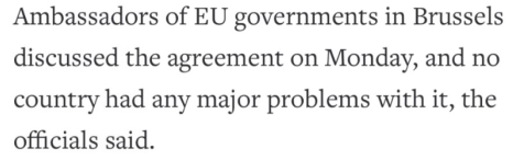而早在协定达成的2天前,12月28日,路透社就获知,欧盟27个成员国驻欧盟总部大使就中欧投资协定的谈判情况进行评估,没有一国大使提出重大异议。这为12月30日的官宣——双方如期完成谈判铺平道路。