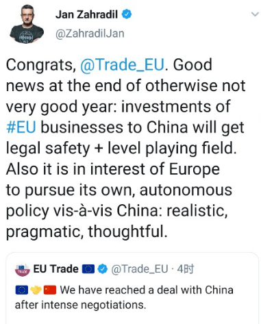 欧洲议会国际贸易委员会第一副主席扎哈迪尔(Jan Zahradil)第一时间在社交媒体上祝贺说:“2020年原本不太好,但年底的这则好消息改变了这一年。”此协定有利于欧洲企业更好地在华投资,正是寻求“自主”对华政策的欧盟所需要的。他用了三个词来形容欧盟“自主的”对华政策:“现实、务实、考虑周全”。