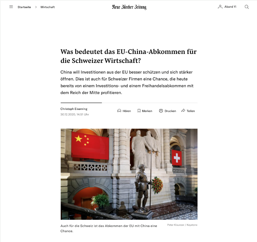 △《新苏黎世报》报道中欧投资协定
