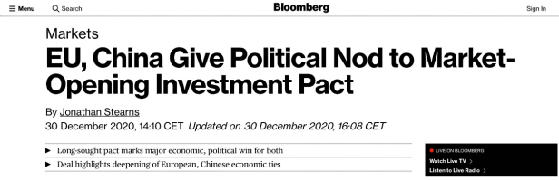 彭博社说,这份中欧长期以来寻求达成的协定,标志着经济与政治层面的重大双赢,同时也凸显出中欧之间不断加深的经济纽带。