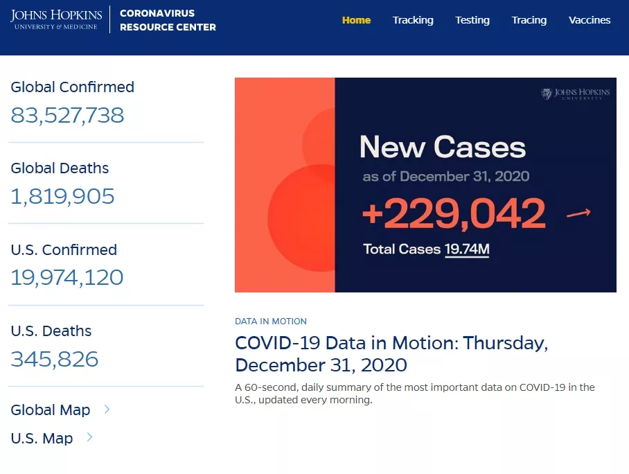 美国约翰斯·霍普金斯大学的统计数据显示,截至当地时间2020年12月31日,美国累计新冠肺炎确诊病例逼近2000万例,为19974120例,病亡345826例。