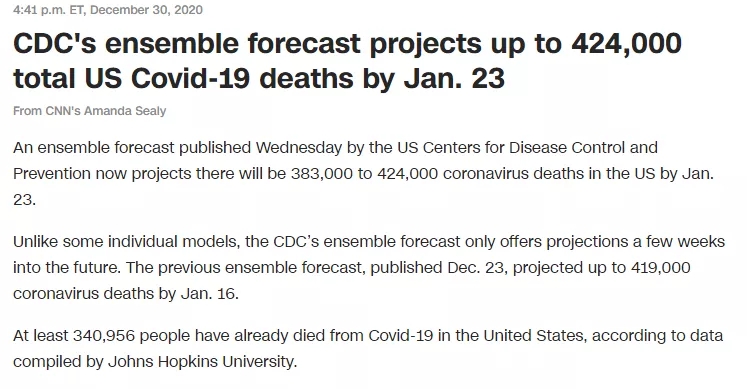 美国疾控中心2020年12月30日发布的一项预测显示,到2021年1月23日,美国可能将有38.3万至42.4万人死于新冠肺炎。