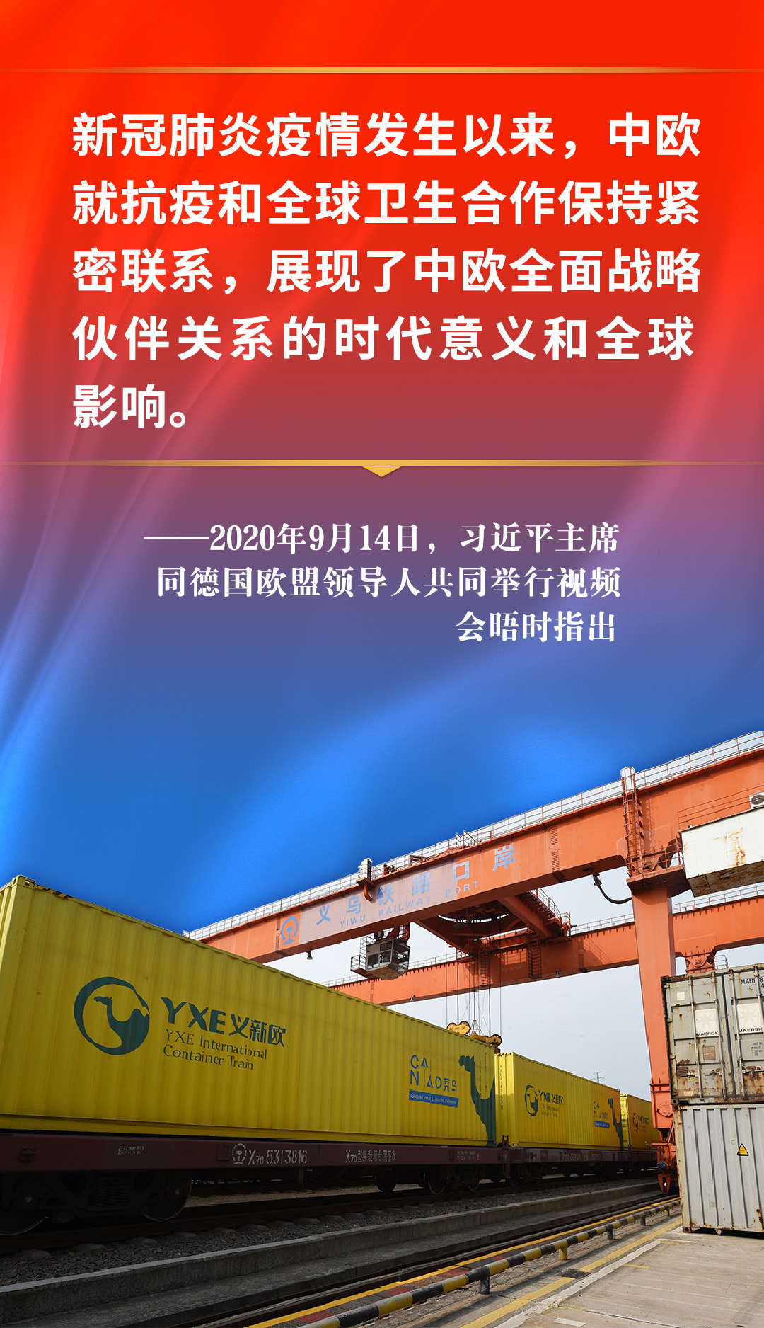 2020年9月14日,中德欧领导人视频会晤。习近平强调,要坚定不移推动中欧全面战略伙伴关系健康稳定发展,为国际社会抗击疫情、恢复经济、维护正义注入更多正能量。