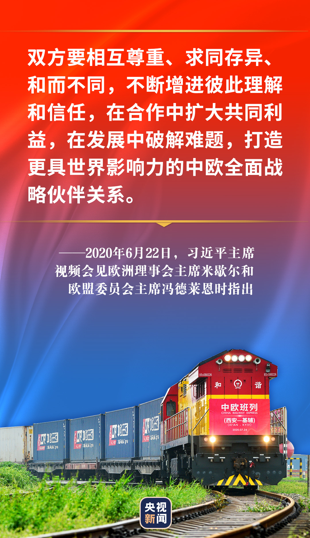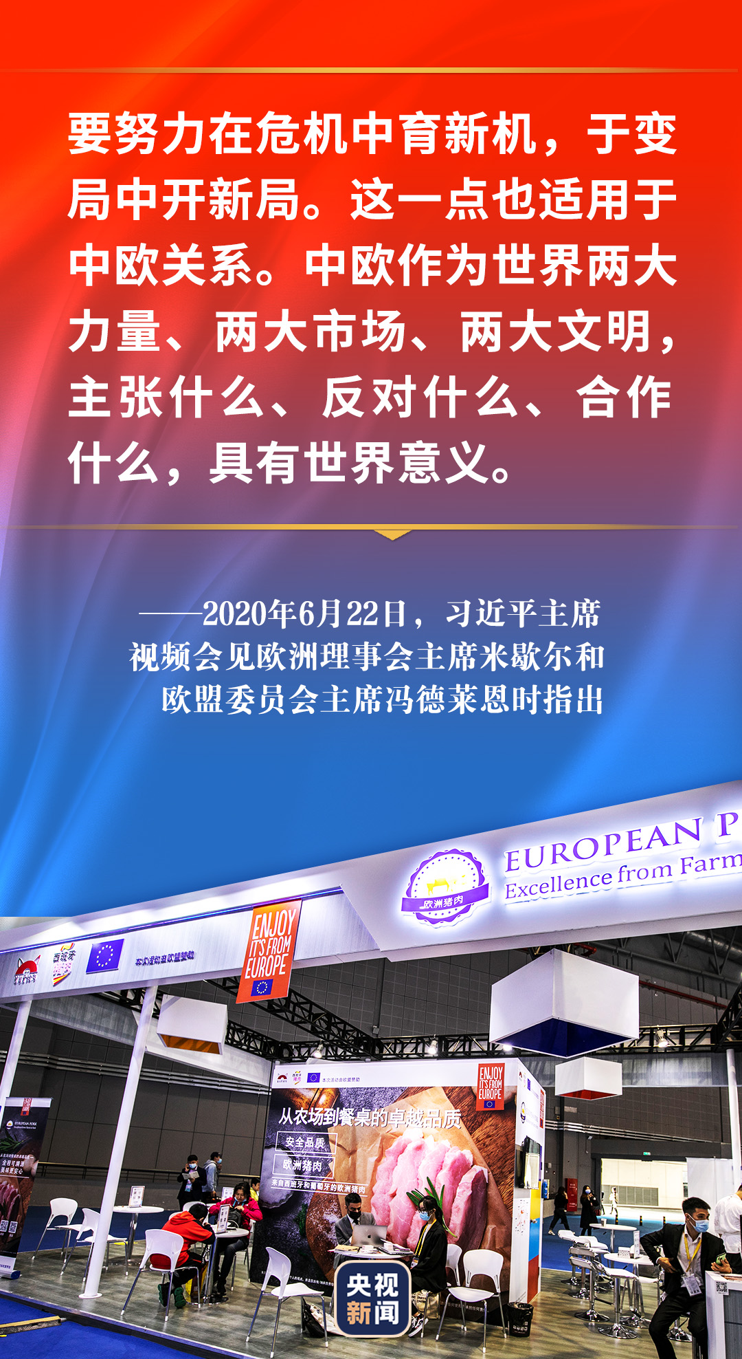 2020年6月22日,习近平视频会见欧洲理事会主席米歇尔和欧盟委员会主席冯德莱恩时表示,中方愿同欧方携手努力,推动“后疫情时代”中欧关系更加稳健成熟,迈向更高水平。