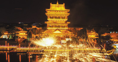 山东台儿庄古城上演“火龙钢花”,送上新年祝福。高启民 摄(新华社发)