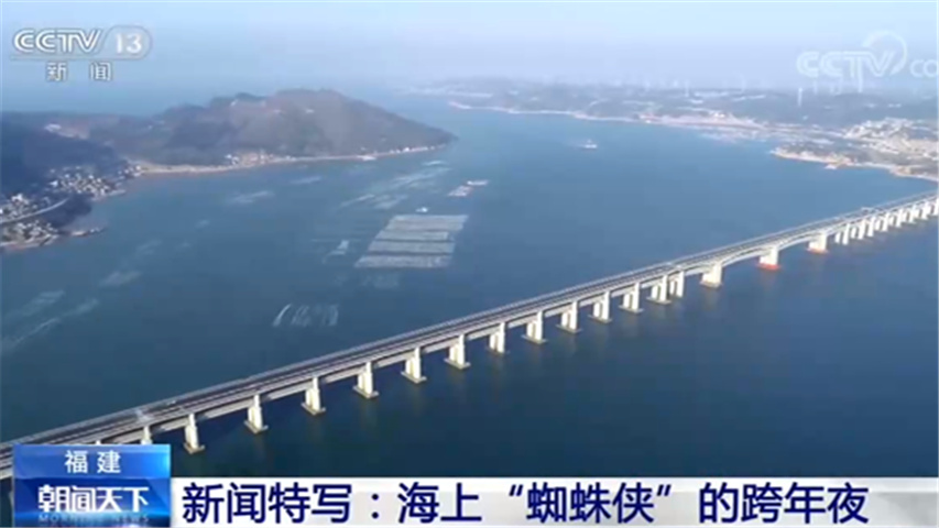 央视网消息:几天前,福建福州至平潭铁路开通运营,其中全长16.34公里的平潭海峡公铁大桥是最重要的区段。新年到来之际,一群把自己称为“蜘蛛侠”的“90后”铁路接触网巡检工在海面上度过了不一样的跨年夜。