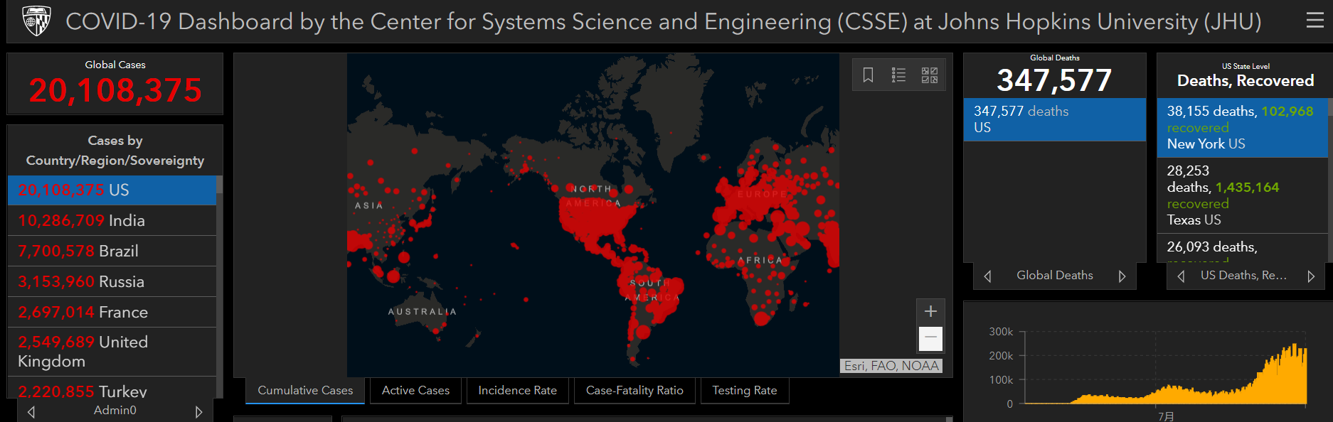 当地时间2021年1月1日,2021年的第一天刚刚开始数小时,约翰斯·霍普金斯大学数据显示,美国新冠肺炎确诊病例超过2000万例。