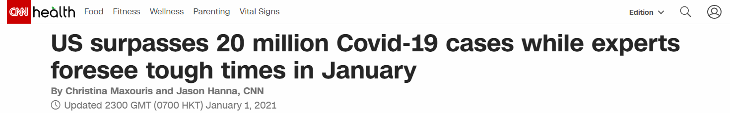 △美国有线电视新闻网1月1日发表题为《美国新冠肺炎确诊病例超2000万例,专家们预测1月迎来艰难时刻》的文章,多名美国专家和医护人员对未来美国新冠疫情仍持悲观态度。(图片来源:CNN)