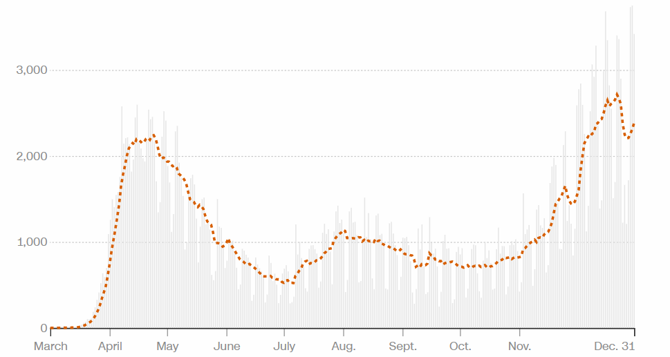 △美国新冠肺炎死亡病例统计图,灰色柱状图例为每日报告的新增死亡人数,橘黄色为7日平均死亡人数。(图片来源:CNN)