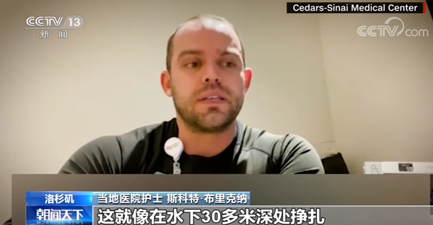 洛杉矶当地医院护士 斯科特·布里克纳:我向朋友描述现在的情况时说,这就像在水下30多米深处挣扎。虽然已经溺水了,但还是要挣扎,因为这是你唯一能做的。