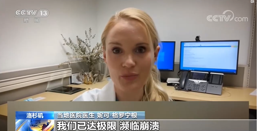 洛杉矶当地医院医生 妮可·格罗宁根:我们已达极限,濒临崩溃。我们非常担心,可能过不了多久,我们就很难找到病床和人手,去救治那些急需帮助的新冠肺炎患者。