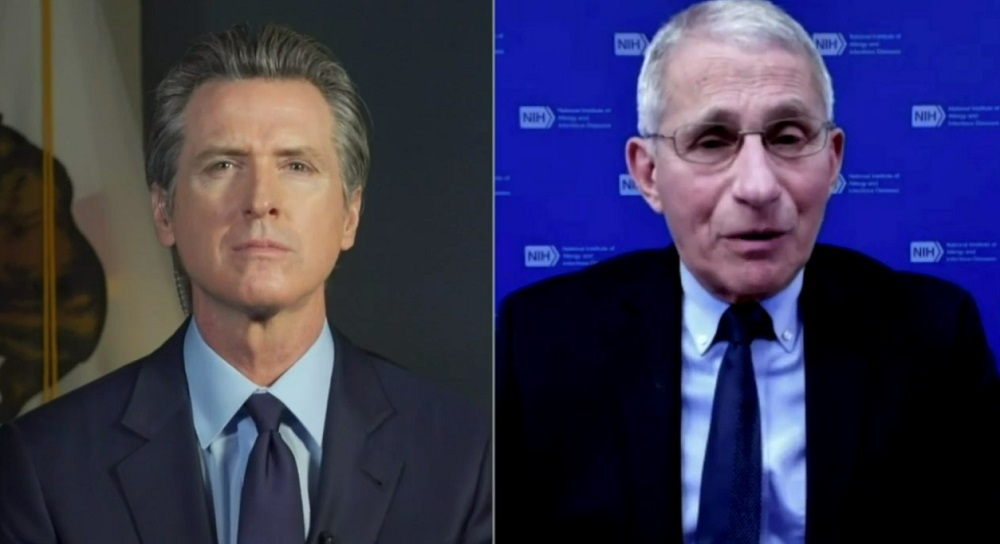 △2020年12月30日,安东尼·福奇(右)与加利福尼亚州州长加文·纽瑟姆(左)进行视频连线,福奇介绍了目前美国在疫苗接种方面遇到的阻碍。