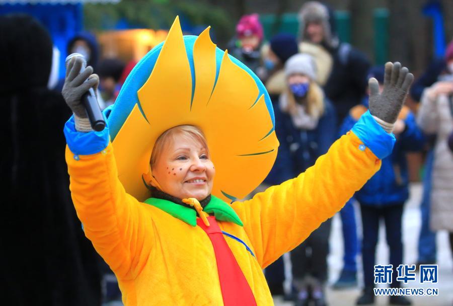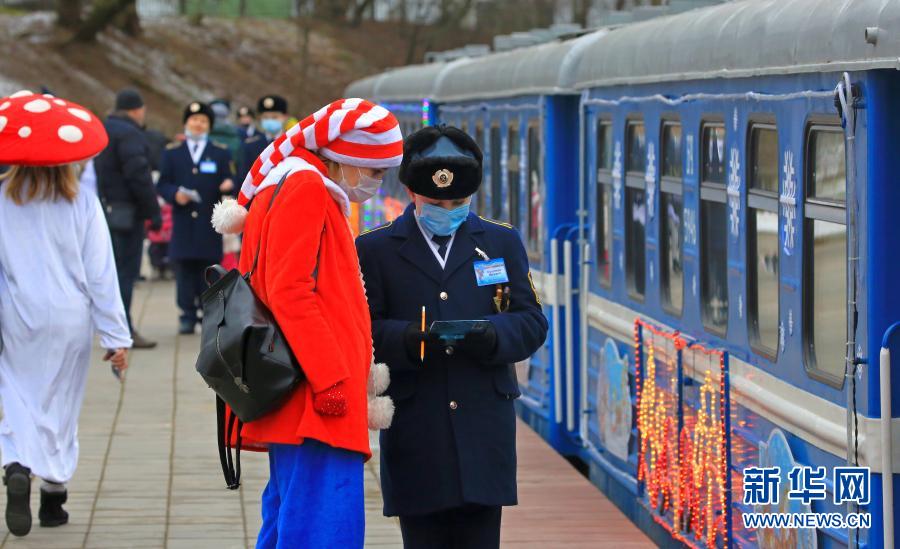 1月2日,演员在白俄罗斯首都明斯克儿童铁路一处车站与人们互动。新华社发(任科夫摄)