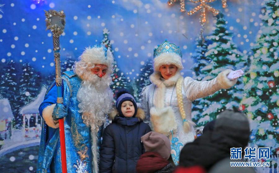 1月2日,在白俄罗斯首都明斯克,打扮成“严寒老人”和“雪姑娘”形象的演员在儿童铁路一处车站与一名儿童合影。新华社发(任科夫摄)