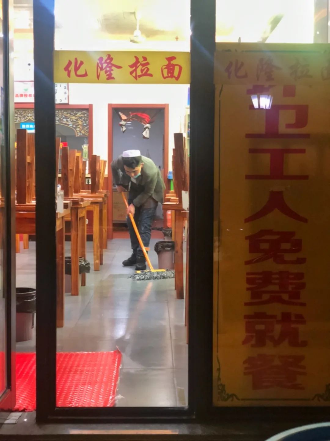 △江苏太仓,拉面店深夜打烊后,马成林打扫卫生