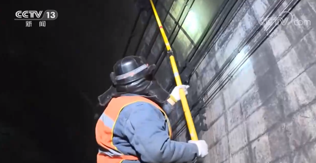 在全长8460米的军都山隧道中,寒风阴冷,崔士旭和工友们一边走,一边抬头看,手电光柱打向隧道上方,像钟乳石一样的冰柱悬在5米多高的隧道顶端。崔士旭熟练地举起4米长的冰竿挥动,四五十厘米长的冰柱哗啦啦地往下落。