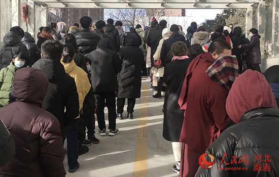 1月6日,石家庄市桥西区鼎明华庭小区的居民在排队检测。 崔艳婷摄