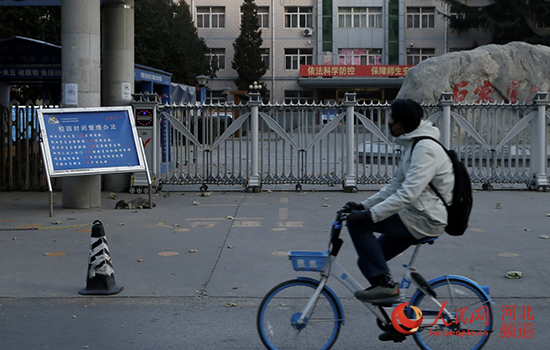 1月6日,石家庄市第六中学门口,摆放了校园封闭公告牌。 杨磊涛摄