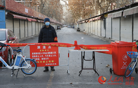 1月6日,志愿者在石家庄市桥西区西里南街市场门口值守,禁止所有人入内。 杨磊涛摄