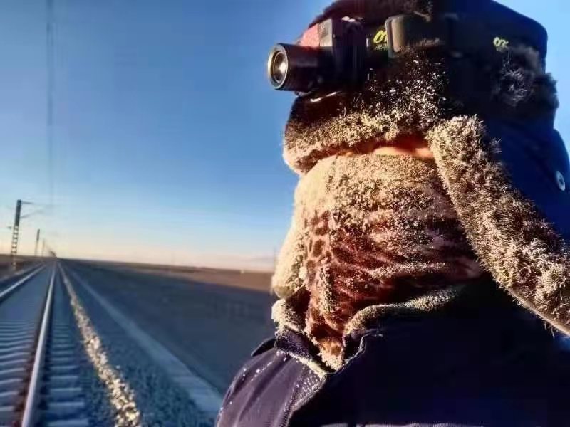 1月6日,大面积寒潮席卷甘肃肃北蒙古族自治县,气温降至零下21度。一望无际的库木塔格沙漠里,坚韧的敦煌铁路在呼呼的风声中蜿蜒前行。