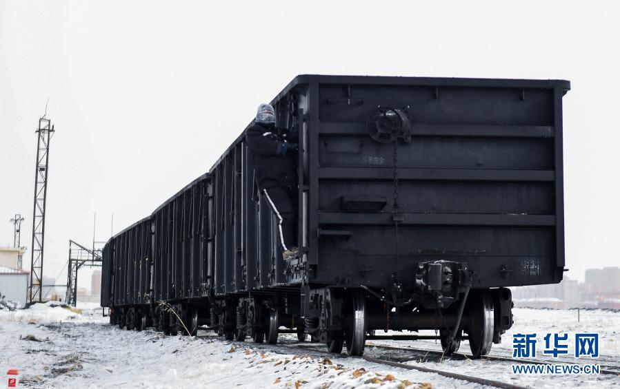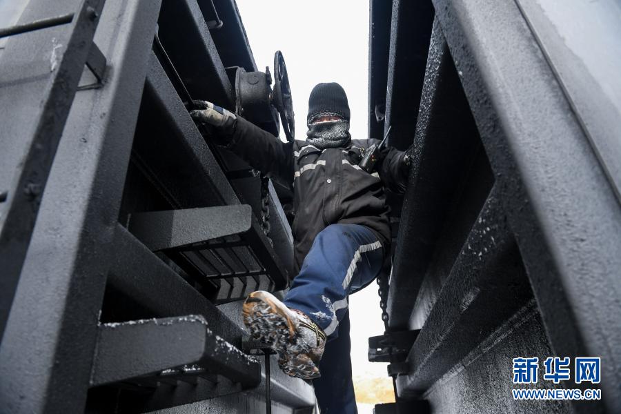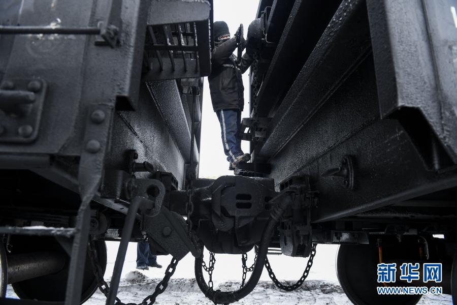 1月8日,在中铁呼和浩特局集团有限公司锡林浩特站,一名调车员随车出发将货列重新编组。新华社记者 贝赫 摄