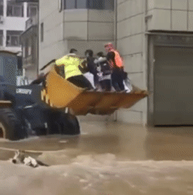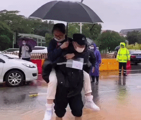 路上积水太多,巡警们将考生一个个背进考场;人走不过,就用铲车送他们准时赴考;巷子太窄,民警就以木桶为舟,带着考生一路乘风破浪。